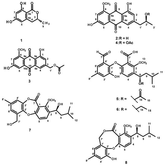 The structures of (R)-6-hydroxymellein (1) [,], penipurdin A (2) [], acetylquestinol (3) [], tenellic acid C (5) [], and vermixocin A (8) [,,] (Figure 1) were elucidated by analysis of their 1D and 2D NMR spectra as well as HRMS data, and also by comparison of their spectral data and signs of optical rotations (Figures S1–S25 and S38–S43, Tables S1–S5) with those reported in the literature.
