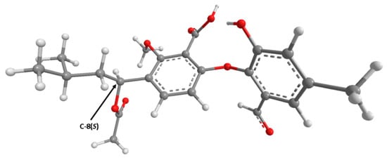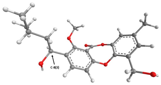 Interestingly, Nishida et al. [] reported the structure of a similar compound containing a 11H-dibenzo[b,e][1,4]dioxepin-11-one scaffold, named purpactin C’ which was obtained by conversion of purpactin C, isolated from a fermentation broth of Penicillium purpurogenum FO-608. However, the authors only presented its HREI-MS, 1H and 13C NMR data (CDCl3, 300 and 75 MHz) of purpactin C’. Later on, Chen et al. isolated purpactin C’ from a gorgonian-derived Talaromyces sp. [], whereas Daengrot et al. also described the isolation of the same compound from a soil-derived Penicillium aculeatum PSU-RSPG105 []. In both cases, the authors reported neither its NMR data nor absolute configuration of the stereogenic carbon in the side chain but only referred to the work of Nishida et al. [].