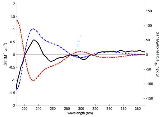 Experimental ECD spectrum of 7 in acetonitrile (solid black line) and theoretical ECD spectra of its (S) (dot–dashed blue line) and (R) (dashed red line) computational models.