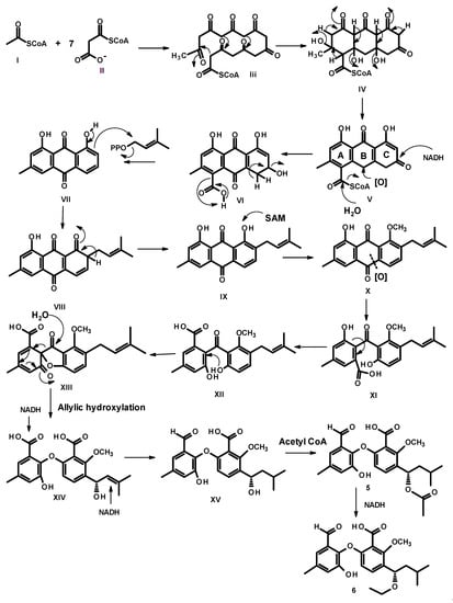 Since the two benzene rings of 5–8 possess the same substitution patterns, it is clearly that they share the same biosynthetic origin and route. Condensation of acetyl CoA (I) and malonyl CoA (II) gives an octaketide III, which undergoes a cyclization to give an intermediate IV. However, instead of enolization, one of the ketone carbonyl in ring C undergoes a reduction to form a secondary alcohol, which, after oxidation of the methylene group in ring B, gives rise to VI. Decarboxylation of ring A and dehydration of the secondary alcohol in ring C of VI gives rise to the anthraquinone VII. Prenylation on the activated carbon in VII by dimethylallyl pyrophosphate (DMAPP) gives rise to a prenyl intermediate VIII, followed by enolization to give an intermediate IX. Methylation of the phenolic hydroxyl group, ortho to the prenyl group, by SAM, leads to the formation of X. Oxidative cleavage of the anthraquinone ring gives rise to XI. Rotation of the bond between the benzene ring (A) and the carbonyl group in XI to XII allows a nucleophilic substitution of the hydroxyl group to give an intermediate XIII. Oxidation of the aldehyde to a carboxylic acid and oxidation of the double bond of the prenyl side chain lead to an intermediate XIV, which, after dehydration, gives XV. Regiospecific hydration of the double bond of the side chain of XV gives XVI, which, after reduction of one of the carboxylic acid group to aldehyde, results in a formation of XVII. Acetylation of the hydroxyl group of the side chain leads to the formation of 5, which, after reduction of the carbonyl carbon of the acetyl group, gives rise to 6 (Figure 6).
