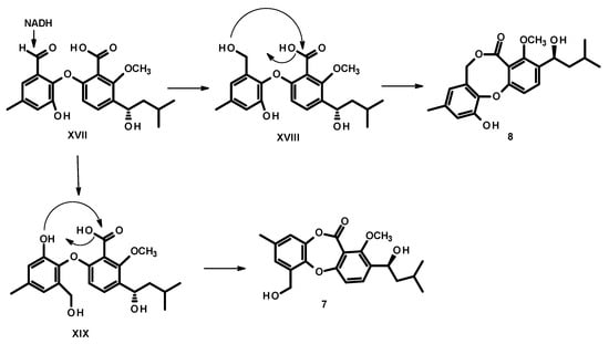 Reduction of the aldehyde group on ring A of XVII to a primary alcohol in XVIII or XIX, followed by esterification of the carboxyl group by the phenolic hydroxyl group (in XIX) or by a hydroxyl group of the primary alcohol (in XVIII) leads to the formation of 7 and 8, respectively (Figure 7).