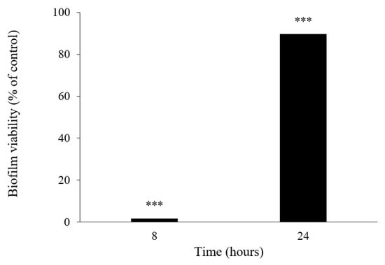 Biofilm viability effect in S. aureus ATCC 29213 in the presence of 6 after 8 and 24 h of incubation. Where *** represent statistical significance of data as p < 0.001.