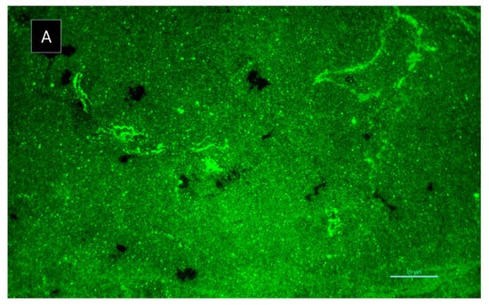 This result led us to investigate the influence of 6 in both biofilm viability (Figure 8) and its matrix spatial arrangement (Figure 9). After 8 h of incubation, the viability of the biofilm of S. aureus ATCC 29213 was significantly affected by 6, exhibiting a percentage of control of 1.80 ± 0.0014, representing a viability reduction of 98%. On the contrary, after 24 h of incubation, the percentage of control increased to 89.65 ± 0.0021, showing only a 10% viability reduction. Although the results herein presented suggest a sublethal effect of 6 on a specific molecular or structural target of S. aureus, that could be reversed over time due to genetic and phenotypic adaptability of bacteria; however, it cannot be ruled out that the compound may undergo some degradation or biodegradation. Further studies are warranted to shed more light on this subject.