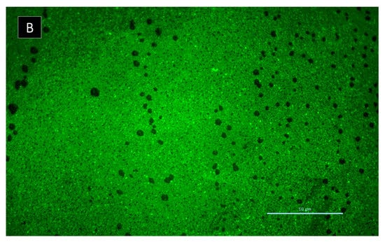 Rhodamine-conA staining of S. aureus ATCC 29213 biofilm: (A) in the absence of 6 and (B) in the presence of 6 after 8 h incubation. Scale bar = 10 µm. Amplification 1000×.