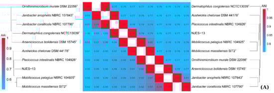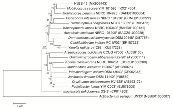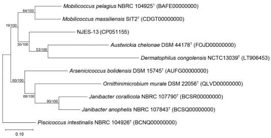 - Hamada, M.; Iino, T.; Iwami, T.; Harayama, S.; Tamura, T.; Suzuki, K. Mobilicoccus pelagius gen. nov., sp. nov. and Piscicoccus intestinalis gen. nov., sp. nov., two new members of the family Dermatophilaceae, and reclassification of Dermatophilus chelonae (Masters et al. 1995) as Austwickia chelonae gen. nov., comb. nov. J. Gen. Appl. Microbiol. 2010, 56, 427–436. [Google Scholar] [CrossRef]