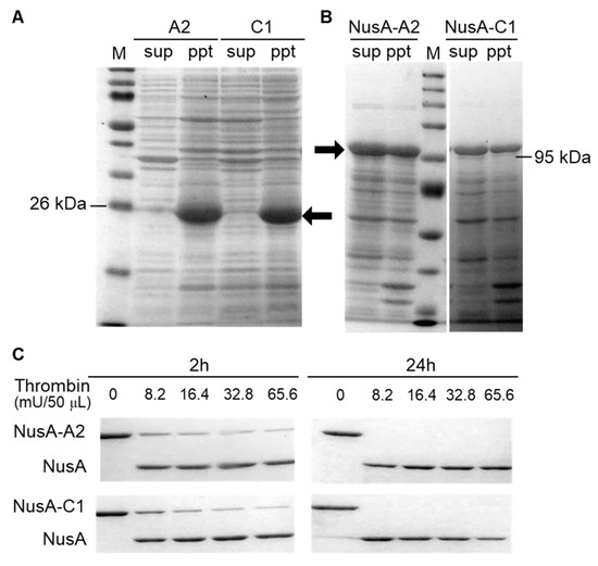 Expression and digestion pattern of crustacyanin. (A) Native crustacyanin A2 and C1 are represented by the arrows; (B) NusA-tagged crustacyanin A2 and C1 proteins are represented by the arrows. The abbreviations “sup”, “ppt” and “M” represent supernatant, pellet and molecular marker, respectively; (C) Cleaving the NusA-tag from the A2 and C1 proteins tagged with NusA. Biotinylated thrombin was added to NusA-A2 and NusA-C1 crustacyanin in a 50 μL reaction mixture at different concentrations shown for 2 or 24 h. Concentration of acrylamide used in SDS-PAGE is 8.0%.