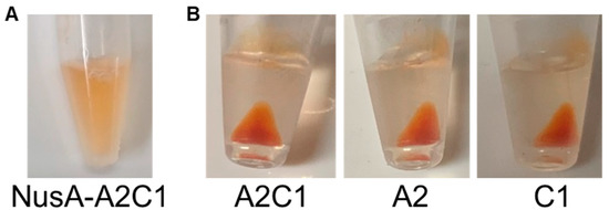 The crustacyanin A2C1 complex has been reported to have the ability to bind to astaxanthin [21]. The binding ability of A2C1 was compared when tagged with or without NusA. The NusA-A2C1 and NusA-free A2C1 complexes were constructed by mixing the NusA-A2/NusA-C1 proteins and NusA-free A2/C1 proteins, respectively. The astaxanthin was solubilized in buffer with the NusA-A2C1 complex and no precipitation was observed after centrifugation (Figure 2), which indicated that the astaxanthin had solubilized in the aqueous phase.