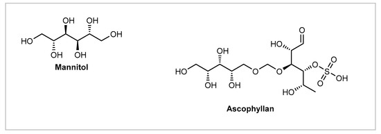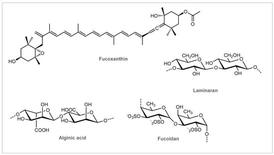Brown seaweeds belonging to two different taxonomic orders, Fucales (Ascophyllum Nodosum) and Laminariales (Laminaria ochroleuca), were used as ingredients in 17% of the studied cosmetic formulations. The brown color presented by these species results from the dominance of the pigment fucoxanthin (Figure 3), which masks the other pigments (chlorophyll a and c, β-carotene, and other carotenoids) and, as reserve substances, oils and polysaccharides [31]. The main polysaccharide found in the brown seaweeds is alginic acid, while laminarins (up to 32–35% dry weight) and fucoidans appear as sulfated polysaccharides (Figure 3).