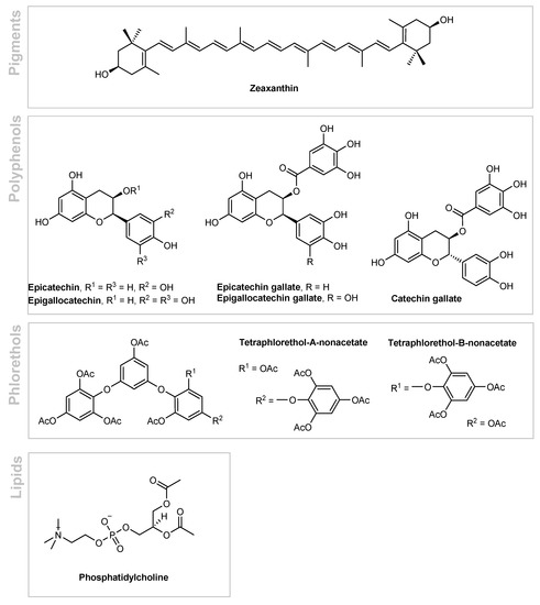 Laminaria ochroleuca is a yellow brown digitate kelp presently distributed from Morocco to southwest England in the United Kingdom [42]. This species is highly sensitive to temperature, which models their growth and performance, and the recent ocean warming has led to a proliferation of Laminaria ochroleuca by extension of their geographical ranges to new habitats [43]. Due to these temperature and geographical changes, along with other variables such as habitat, season of harvesting, and environmental conditions (light, temperature, and salinity), this species experiences major shifts in their composition. An interesting study on the effect of different harvesting times, depths, and growth conditions of Laminaria ochroleuca revealed considerable differences in both qualitative and quantitative pigment profiles [44]. Significant seasonal variations in the photosynthetic pigment composition of Laminaria ochroleuca were observed which point to the occurrence of a photoprotective mechanism in the algae that deflects energetic resources to pigment biosynthesis. The samples collected in months with higher sun exposure (June–October) exhibited higher amounts of zeaxanthin, β-carotene, and chlorophyll c (Figure 4), with some species presenting nearly twice the levels of pigments, amongst which carotenoids were the most prevalent (56.1% of the total quantified) [44]. Another study dealing with the determination of phenolic compounds in Laminaria ochroleuca for human consumption revealed epigallocatechin (Figure 4) as the main polyphenol (760.2 ± 5.2 µg/g dry weight), followed by epicatechin (28.7 ± 2.0 µg/g dry weight), catechin gallate (21.4 ± 5.7 µg/g dry weight), epicatechin gallate (11.2 ± 1.6 µg/g dry weight), and epigallocatechin gallate (9.7 ± 1.3 µg/g dry weight) [45]. These polyphenols have been shown to provide an antioxidant, anti-inflammatory, and UVB protective action [46,47]. Other phenolic derivatives include linear phlorethols, containing either ortho, meta-, or para-oriented (or even a combination) C–O–C oxidative phenolic couplings (Figure 4) as exemplified in tetraphlorethols A and B [48].
