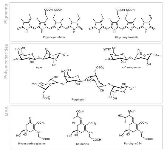 Asparagopsis armata is a red seaweed which can be found in European coasts and in the Northeast Atlantic [70]. The main photosynthetic pigments of red algae are chlorophyll a, carotenoids (lutein, zeaxanthin, β-carotene) and phycobilins (phycocyanin and phycoerythrin), water-soluble pigments localized in the phycobilisomes, which give red algae their distinctive color [71]. Phycocyanin has been shown to provide anti-inflammatory, antioxidant, and wound-healing properties [72]. Besides photosynthetic pigments, red algae are also constituted of other interesting bioactive compounds (Figure 6), including agar [39], sulfated polysaccharides (carrageenans and porphyrans) [73,74], and mycosporine-like amino acids (MAA) [75,76,77,78].