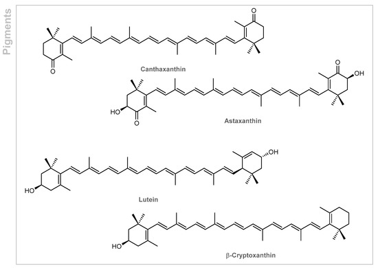 Marine microalgae also constitute an innovative source of bioactive compounds such as polyunsaturated fatty acids, tocopherols and sterols, vitamins and minerals, antioxidants, and pigments (e.g., chlorophyll and carotenoids), with great relevance in medical, pharmaceutical, and cosmetic fields [85]. Due to their unicellular or simple multicellular structure, they can grow rapidly and live under harsh conditions and environmental stressors such as heat, cold, anaerobiosis, salinity, photooxidation, osmotic pressure, and exposure to ultraviolet radiation [85]. The microalgae usually commercialized and used in biotechnology belong to the green algae, Chlorophyceae (such as Chlorella vulgaris, Haematococcus pluvialis, Dunaliella salina, and cyanobacteria) [85]. Their composition varies according to species and culture environments such as light intensity, temperature, pH, salinity, and medium [86]. Chlorella vulgaris is mainly constituted by proteins (43–58%), lipids (5–58%), carbohydrates (12–55%), pigments (chlorophyll (1–2%) and carotenoids (0.4%, astaxanthin, lutein, β-carotene, lycopene, canthaxanthin, see Figure 7 for examples)), vitamins (vitamins A, B, C, and E), and minerals (calcium, potassium, magnesium, and zinc) [86].