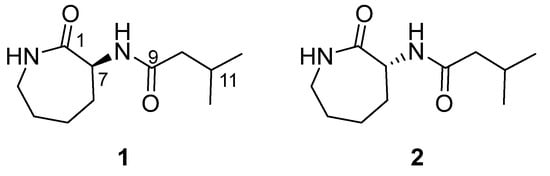 Compound 1 was synthesized to provide a sufficient material for pharmacological investigations. A racemic mixture of d/l-α-amino-ε-caprolactam (51.28 mg, Tokyo Chemical Industry, Tokyo, Japan) and Na2CO3 (127.2 mg) in water (5 mL) was added to a solution of isovaleryl chloride (49 µL) in CH2Cl2 (5 mL) at 25 °C, and the flask was incubated overnight. The organic layer was separated, and the residual aqueous phase was extracted twice using CH2Cl2 (5 mL). The combined organic layers were dried under reduced pressure. The residue was subjected to HPLC using a chiral column (CHIRALPAK AD-H, 5 μm, 250 × 4.6 mm) to separate the chiroptically pure compound 1 and its enantiomeric pair. Isocratic elution of the mixed solvent (n-hexane:isopropyl alcohol = 90:10) resulted in the isolation of 1 (retention time of 13.44 min, 27.2 mg) and 2 (retention time of 8.75 min, 22.9 mg).