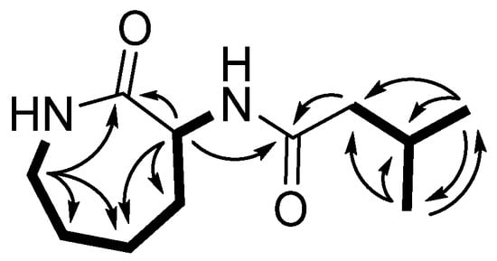 The planar structure of 1 was determined by two-dimensional NMR spectroscopic data analyses, including correlation spectroscopy (COSY), phase-sensitive heteronuclear single quantum coherence (HSQC), and heteronuclear multiple bond correlation (HMBC) spectra analyses (Figures S4–S6). A series of COSY correlations of 1 revealed two spin systems. The first spin system consisted of four methylene protons (H-3, H-4, H-5, and H-6) and one methine proton (H-7) between two NH protons (H-2 and H-8), as shown in Figure 2. In addition, two doublet methyl protons (H-12 and H-13) exhibited an intense COSY correlation with a methine proton at δH 2.11 ppm (H-11), which also exhibited a COSY correlation with a methylene proton at δH 2.09 ppm (H-10). These two discrete spin systems were also confirmed by HMBC correlations from H-3 to C-4/C-5, from H-7 to C-5/C-6, and from H-12/H-13 to C-10 and C-11. In addition, the two major HMBC correlations from H-7/H-10 to C-9 suggested that there was an amide bond connection between the two spin systems. Furthermore, the HMBC correlations from two methylene protons at δH 3.30 ppm and 3.24 ppm (H-3) and a methine proton at δH 4.54 ppm (H-7) to one of the carbonyl carbons at δC 175.75 ppm (C-1) revealed a caprolactam structure possessing an amide bond between C-3 and C-7.