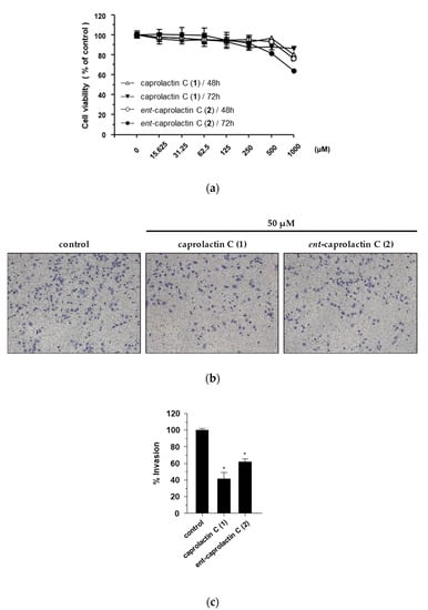 The cell invasion potential of the compounds was assessed using a Transwell assay, as described previously []. In summary, the cells in a serum-free medium were seeded (1.5 × 104 cells) onto the upper surfaces of Matrigel-coated Transwell chambers (BD Biosciences, Franklin Lakes, NJ, USA), and 50 μM of caprolactin C (1) and ent-caprolactin C (2) were added, separately. The lower compartments of the chambers were filled with the medium supplemented with 10% fetal bovine serum (FBS). After 16 h of incubation, the cells that invaded the lower surface of the filter were fixed with 70% ethanol for 10 min and stained with 0.2% crystal violet for 10 min. The invaded cells were counted under an Eclipse TE2000-U microscope (Nikon).