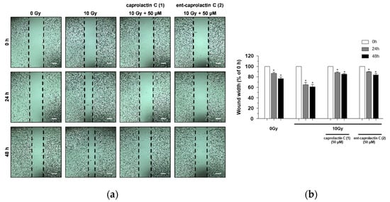 A549 cells were seeded in a 24-well plate (3.5 × 105 cells/well) and incubated overnight. To generate a wound area, the cells were scratched with a 200-μL pipette tip and exposed to 10 Gy of γ-IR using a 137Cs γ-ray source (Atomic Energy of Canada, Mississauga, ON, Canada) at a dose rate of 3 Gy/min. The irradiated cells were incubated for 24 h with 50 μM of caprolactin C (1) and ent-caprolactin C (2) each. The images were analyzed at 0 h and 24 h using an AE31 microscope (Motic, Hong Kong).