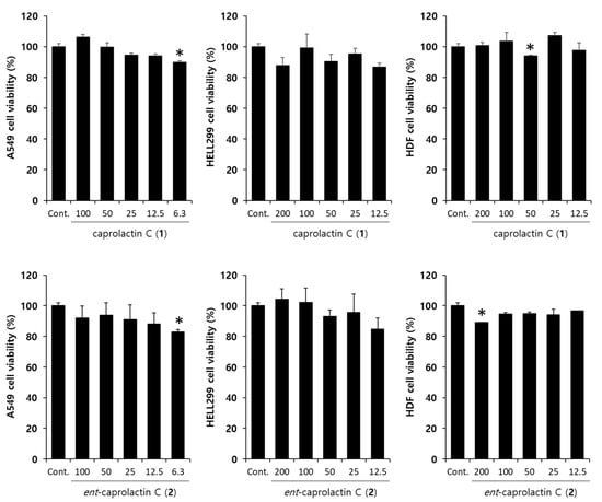 Effect of caprolactin C (1) and ent-caprolactin C (2) on the viability of the A549, HELL299, and human dermal fibroblast (HDF) cells. The cells were plated at a density of 1 × 104 cells/well in a 96-well plate and subsequently treated with 1 and 2 at the indicated concentrations for 48 h. Cell viability was measured by the MTT assay, as described in Section 4. Data are presented as the mean ± SD of three independent experiments. * p < 0.01 versus the control group.