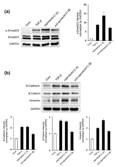 We first investigated whether caprolactin C (1) or ent-caprolactin C (2) could inhibit the phosphorylation of Smad2/3 by TGF-β. As shown in Figure 6a, the TGF-β-induced phosphorylation of Smad2/3 was inhibited by the treatment with 2, but 1 increased the Smad2/3 phosphorylation in A549 cells. We quantified the intensity of the immunoblot bands using ImageJ software. As shown in Figure 6a, 2 slightly inhibited TGF-β-induced p-Smad2/3, while 1 increased TGF-β-induced p-Smad2/3. Next, we examined the expression of mesenchymal cell marker proteins, such as N-cadherin, β-catenin, and vimentin, after the A549 cells were treated with 1 or 2.