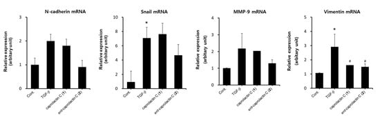 Next, we investigated whether ent-caprolactin C (2) inhibited EMT at the mRNA expression level in A549 cells. As shown in Figure 7, the mRNA expression levels of the TGF-β-induced mesenchymal markers, such as N-cadherin, MMP-9, Snail, and vimentin, were inhibited by 2. The treatment with caprolactin C (1) did not affect the mRNA expression levels of N-cadherin, MMP-9, and Snail in A549 cells. However, vimentin mRNA expression was suppressed by both compounds 1 and 2. Thus, further investigations, such as checking the mRNA expression levels at different time courses in A549 cells, are required. Collectively, these results indicate that 2 is an effective agent for the suppression of EMT.