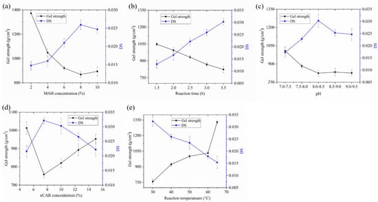 The effects of MAH concentration on DS and gel strength are illustrated in Figure 1a. Each κCar structural unit has three -OH groups and one sulphate group. MAH could replace one of the hydroxyl groups and be grafted onto the κCar structural unit [11]. The concentration of MAH possibly affected the diffusion of MAH into the κCar molecules. When the MAH concentration was increased from 2% to 8%, the available MAH groups around the κCar molecule increased, leading to an increase in DS. However, an overly high concentration of MAH was unfavorable for the substitution. In order to maintain the reaction pH constant, it was necessary to add vast quantities of alkali, which resulted in the swelling of κCar and difficulty to agitate the reaction system, thus reducing the DS. Moreover, gel strength was negatively correlated with DS. This result may be attributed to the introduction of substituents that broke and loosened up the hydrogen bonding between κCar molecules [27], which prevented the synthesis of double helix chains. Thus, 8% was selected as the optimal MAH concentration in the subsequent experiments.