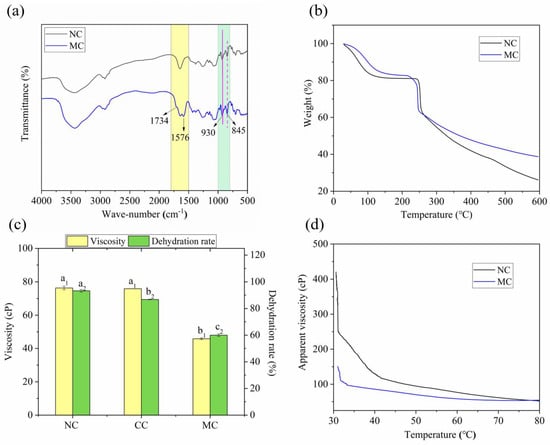 (a) FT-IR spectra; (b) TGA spectra of NC and MC; (c) viscosity and water-holding capacity of κCar samples; (d) viscosity–temperature curves of NC and MC; CC: control κCar. a1, b1 on the bar graph indicate significant differences in viscosity (p < 0.05) and a2, b2, c2 indicate significant differences in dehydration rate (p < 0.05) in Figure 2c.