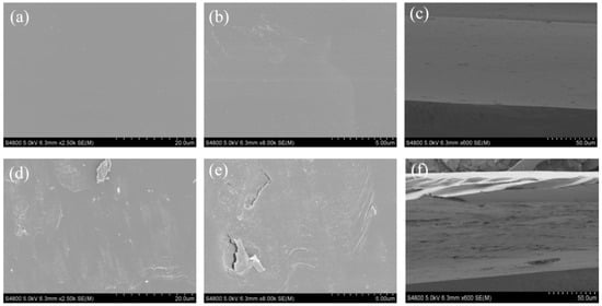 (a,b) SEM surface images of NC films magnified by 2500× and 8000×, respectively; (c) SEM cross-section image of NC films; (d,e) SEM surface images of MC films magnified by 2500× and 8000×, respectively; (f) SEM cross-section image of MC films.