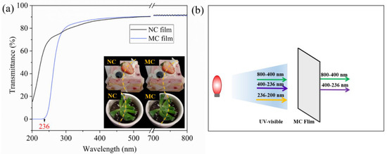 (a) Light transmittance of the films and (b) UV absorbability of the MC film.