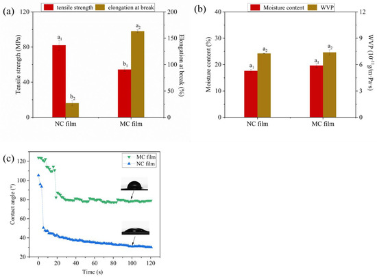 Moisture content, water vapor permeability (WVP), and water contact angle were used to determine the water resistance of the films. The effects of κCar modification on the water resistance of MC films are shown in Figure 5b. No significant differences (p > 0.05) in moisture content and WVP were noticed between the NC and MC films, indicating that κCar modification only had a slight effect on the moisture content and WVP of κCar films. The water contact angle reflects the hydrophilic/hydrophobic surface properties of the materials. In general, a material with hydrophobicity also has a high contact angle. As can be seen in Figure 5c, the contact angles of both MC films were higher than those of NC films as time increased. The contact angles of MC and NC films were kept at approximately 78° and 30°, respectively. This revealed that the surface hydrophobicity of κCar-based films was improved after MAH modification, which could be related to the increased roughness of the MC films compared with that of the NC film, as shown in the SEM micrographs (Figure 3). In addition, the introduction of hydrophobic MAH molecules and the reduction of hydrophilic groups (-OH) due to the covalent bonds formed between MAH molecules and κCar were other reasons for the increased surface hydrophobicity of MC films [46,47].
