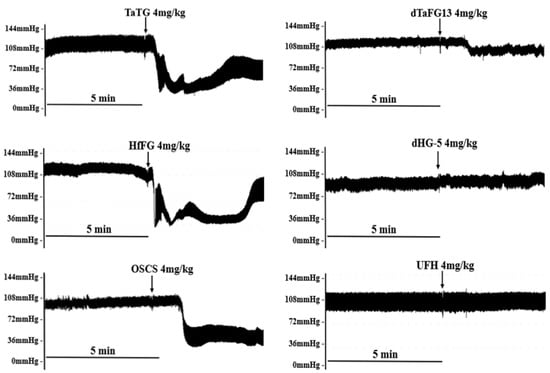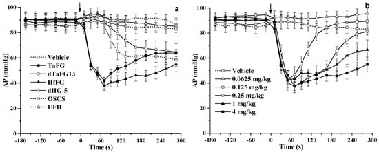 TaFG and HfFG at 4.0 mg/kg injected into the rats caused an immediate drop of arterial pressure (AP) by 55% and 63%, respectively, and their activity was stronger than OSCS, which resulted in hypotension by 35% (Figure 2, Figure 3 and Table S1). The dTaFG13 injection caused mild and a delayed drop of rat blood pressure, while dHG-5 and heparin (UFH) had no obvious effects. The dose–effect relationship of HfFG was also studied (Figure 3 and Table S1). Rats treated with HfFG (0.125~4.0 mg/kg) showed severe hypotension with the similar peak effect at about 1 min, while the recovery time was increased with the dose. HfFG showed the lethal effect at 1 mg/kg and above, and had no obvious effect on blood pressure at 0.0625 mg/kg.