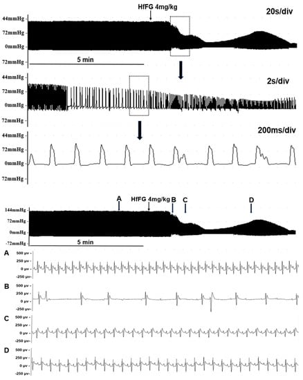 Effect of HfFG (i.v.) on rat left ventricular pressure (upper) and electrocardiogram (below). Data were recorded by a multi-channel physiological signal-collecting instrument before and after treatment. For the left ventricular pressure, different time scales were shown. For the electrocardiogram, different time points (A–D) in the left ventricular pressure recording were shown, time scale of (A–D) was 80 ms/div. Arrows indicate the administration of the test compound. Representative graphs are shown, n ≥ 8.