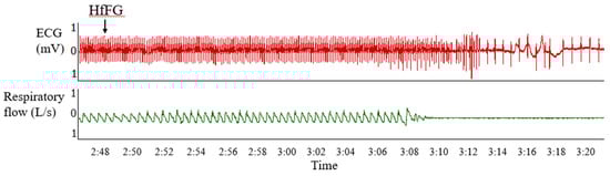 Effects of HfFG (i.v.) on rat ECG and the respiratory wave. Data were recorded by a multi-channel physiological signal-collecting instrument before and after treatment. HfFG was at 4.0 mg/kg and arrows indicate the administration of the test compound. Representative graph is shown and the experiment was repeated three times. Abbreviation: ECG, electrocardiogram.