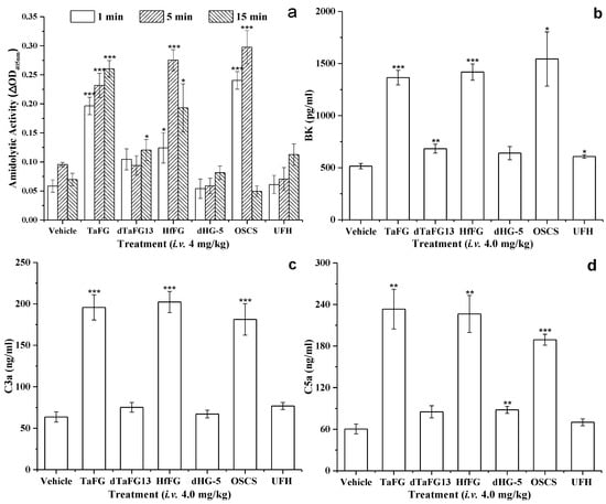 Previously, in vitro assays showed that native FGs exhibit potent activity in plasma contact activation and platelet aggregation [,]. As expected, the injection of TaFG and HfFG significantly increased the kallikrein activity of rat plasma, and their activities were comparable to OSCS (Figure 6a). Compared with the control, dTaFG13 slightly enhanced the activation of the contact system in rat plasma, while UFH and dHG-5 caused no significant change. Once the contact system is activated, the reciprocal activation between prekallikrein and FXII produces more kallikrein []. Kallikrein can cleave high molecular weight kininogen (HMWK) to generate the vasoactive peptide BK, and mediate the generation of anaphylatoxins C3a and C5a [,,]. These downstream products were detected, plasmas from rats treated with OSCS, TaFG, or HfFG had significantly increased levels of BK, C3a, and C5a, but not those treated with dTaFG13 and dHG-5 (Figure 6b–d).