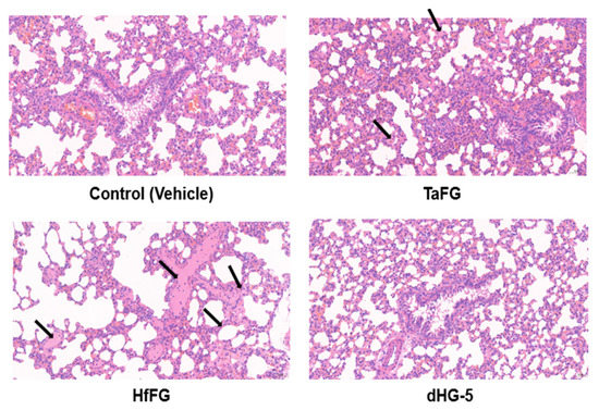 Rat pulmonary microvessel embolism induced by native FGs. Rat were i.v. injected with TaFG (4.0 mg/kg), HfFG (4.0 mg/kg), dHG-5 (6.7 mg/kg), or the vehicle and after 5 min the lung was collected for histopathological assays. Experiments were conducted in triplicates and represented results are shown.
