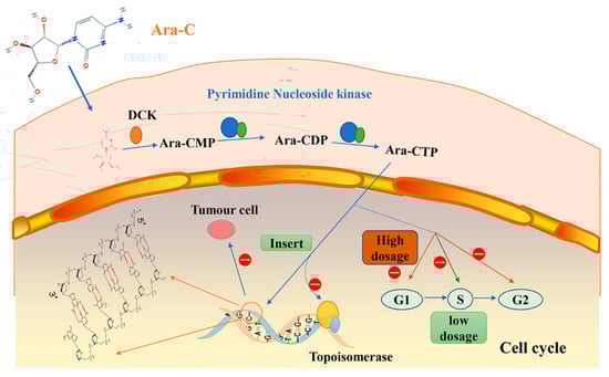 Cytarabine is metabolized in vivo and transformed into its active form “ara-CTP”. The entire process involves three steps [13]. First, cytarabine is converted to the inactive form arabinouridine (Ara-U) after deamination and only small amount of cytarabine subsequently enters into the cell. Cytarabine is catalyzed into Ara-CMP via deoxycytidine kinase (DCK) in the cytoplasm. Second, Ara-CMP is transformed into Ara-CDP by pyrimidine nucleoside kinase. Third, the Ara-CDP is metabolized into Ara-CTP. Ara-CTP may be incorporated into the nucleotide chain of ribonucleic acid (DNA), which prevents chain elongation and causes chain breaks. By affecting the replication of the chain, the drug inhibits the proliferation of tumor cells. Studies have shown that Ara-CTP can bind to the topoisomerase complex limiting its activity by inhibiting DNA synthesis (Figure 1) [14].