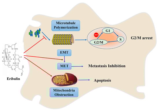 Eribulin exerts its anticancer effects by inducing cell cycle arrest, apoptosis, and tumor metastasis inhibition.