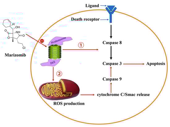 Proteasome degradation plays a critical role in the survival of malignant tumor cells. The increase of proteasome has been observed in various types of tumor cells, indicating that the survival and growth of tumor cells rely on the proteasome [36]. In the late stage of plasma cell differentiation, proteasome activity decreases with the accumulation of immunoglobulin, leading to the accumulation of ubiquitinated protein [37]. Marizomib (NPI-0052), a natural compound isolated from marine Salinispora tropica [38], possessing a γ-lactam-β-lactone fragment is a proteasome inhibitor. Studies have shown that marizomib induces loss of mitochondrial membrane potential, increases ROS production, cytochrome C/Smac release and activation of caspases, leading to multiple myeloma cell apoptosis [39]. Marizomib may also exert antitumor activity through the inner mitochondrial apoptotic pathway and death receptor pathway (Figure 3) [40,41,42]. Inhibition of the proteasome by marizomib is generally considered to be the result of inhibiting the NF-κB pathway. Proteasome inhibition increases the level of IκBα, thereby inhibiting the NF-κB pathway, resulting in a decrease in the production of anti-apoptotic factors, angiogenic factors and inhibition of apoptosis [43]. Proteasome inhibition leads to an imbalance in the self-regulation of cyclins, cyclin-dependent kinases and other cell cycle regulatory proteins and this can disrupt cell division.