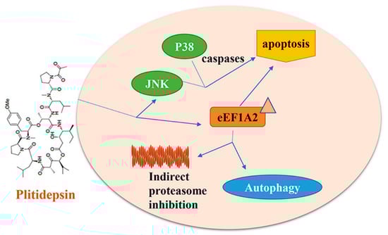 The mechanism of plitidepsin in treating multiple tumors has been thoroughly investigated. Plitidepsin exhibits anticancer effects by inhibiting tumor cell proliferation and inducing cell apoptosis in multiple myeloma (MM), plasmacytoma, prostate cancer, pancreatic cancer, and ovarian cancer [52,53]. Plitidepsin treatment resulted in oxidative stress, rapid activation of Rac1 GTPase, and continuous activation of c-Jun N-terminal kinase (JNK) and p38 mitogen-activated protein kinase (p38/MAPK), leading to caspase activation and cell apoptosis (Figure 4) [54]. Recent studies have found that the translation elongation factor eEF1A2 is the primary target of plitidepsin, which can bind to eEF1A2 at the interface between domains 1 and 2 of this protein in the GTP conformation [51,55,56]. It has been further reported that plitidepsin also inhibits the activation and subsequent destruction of aggregates in lysosomes, which accumulate excessive misfolded proteins in cells, thereby triggering apoptosis. In chronic lymphocytic leukemia (CLL), plitidepsin affects the viability of leukemic cells through direct and indirect pathways. It inhibits the malignant B-CLL clone directly and restrains tumor growth by indirect modification of the micro-environment [53]. A recent study showed that plitidepsin analogs PM01215 and PM02781 inhibit angiogenesis in vitro and in vivo [57].