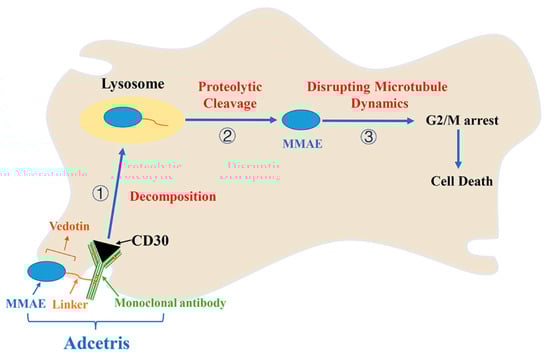 Adcetris, or Brentuximab Vedotin is an antibody drug conjugate which couples a CD30 antibody and a tubulin targeted compound, monomethyl auristatin E (MMAE). Compound MMAE is a derivative of natural compound dolastatin 10 isolated from Dolabella auricularia [78,79,80]. Adcetris was approved in 2011 to treat Hodgkin’s lymphoma (HL) and systemic anaplastic large cell lymphoma (ALCL) [81]. Adcetris consists of three parts: a monoclonal antibody with a targeting function, which can guide adcetris to its target cells; an effective cytotoxic compound called the payload or warhead, which has the pharmacological effect of killing tumor cells; and a central part composed of hexanoic acid and maleimide that has a linking function. It can covalently connect the first two parts and be further responsible for releasing payloads and linkers in the target cells [82,83,84,85]. Brentuximab is a monoclonal antibody that locates tumor cells by searching for the tumor marker CD30 membrane protein. Vedotin is the second part of the conjugate, including the linker and the cytotoxic principle MMAE. To meet the requirements, the main ingredient of linker in adcetris is cathepsin-cleavable valine-citrulline, which can be cut precisely to release a cytotoxic compound. Adcetris exerts its anticancer activity in a few steps in vivo. First, the recognition of brentuximab antibody by CD30 protein leads to the decomposition of adcetris. Then, the selective proteolytic cleavage of adcetris promoted by lysosomal cysteine protease releases vedotin. Second, vedotin releases MMAE in cytoplasm. When free MMAE reaches its goal, it prevents cell division in G2/M by disrupting microtubule dynamics, and ultimately induces cell death (Figure 6) [85,86].