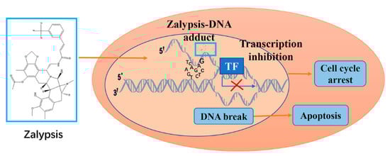 Zalypsis, an alkaloid newly isolated from Joruna funebris, is a tetrahydroisoquinolone alkaloid that is structurally similar to ascidianin and nephromycin [90]. It binds covalently to guanine residues in for example, the AGG, GGC, AGC, CGG, and TGG groups to form a DNA-zalypsis adduct, leading to early transcription inhibition and a double-stranded DNA break, affecting cell proliferation and development (Figure 7) [91,92]. Zalypsis shows antitumor activity against cell lines of bladder cancer, gastric cancer, liver cancer, prostate cancer, pancreatic cancer, thyroid cancer, sarcoma, leukemia, and lymphoma [91,93,94,95,96]. In multiple myeloma, zalypsis in combination with bortezomib and dexamethasone exerts enhanced efficacy with acceptable toxicity in vitro and in vivo [97]. Phase II and Phase III clinical trials have shown that zalypsis is effective in treating Ewing’s sarcoma, urothelial cancer, multiple myeloma, endometrial cancer, and cervical cancer [91,98].