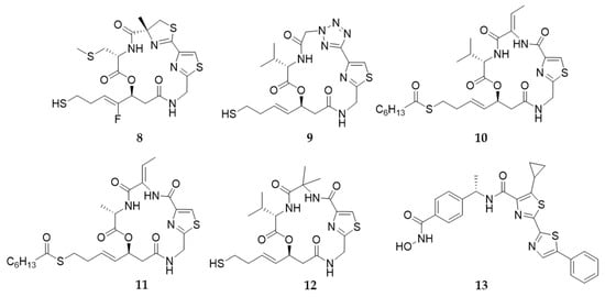 Analogue 12 was obtained by replacing the 4-methylthiazoline group with a simplified α-aminoisobutyric acid residue, which showed a 20-fold reduced nanomolar HDAC inhibition compared to largazole thiol [133]. Recently, Nan and coworkers identified a bisthiazole-based HDAC inhibitor (13) through structural simplification of largazole skeleton. This compound exhibited potent nanomolar HDAC inhibition (HDAC1, IC50 = 3.64 nM; HDAC2, IC50 = 3.02 nM; and HDAC3, IC50 = 4.96 nM) and strong antiproliferative activity against NCI-N87 (IC50 = 28 nM) and T47D cells (IC50 = 40 nM). Furthermore, 13 showed good antitumor efficacy in the HT-29 xenograft model with good oral bioavailability and safety profile [124,141].