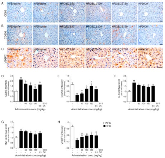 2.2. ECE and DK Led to Decreased M1 Macrophages, Increased M2 Macrophages, and Decreased IL-6 and TNF-α in the Lymphatic Vasculature of Liver