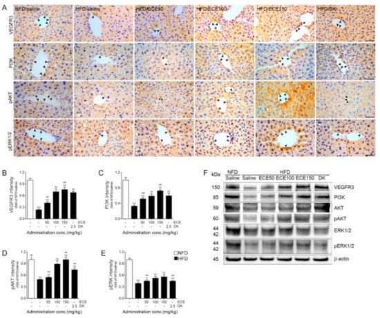 2.3. ECE and DK Increased the Expression of VEGFR3/pERK or VEGFR3/PI3K/pAKT around the Lymphatic Vessels of Liver
