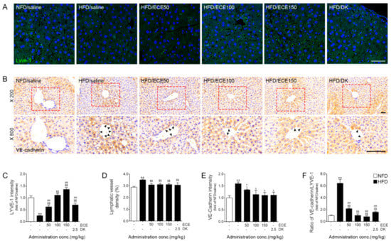 2.4. ECE and DK Increased the Expression of LYVE-1 and Decreased VE-Cadherin in the Lymphatic Vasculature of Liver