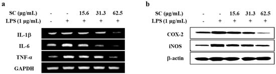 2.2. SC Downregulated the Expression Levels of Inflammatory Cytokines, iNOS and COX-2 Proteins in LPS-Stimulated RAW 264.7 Macrophages