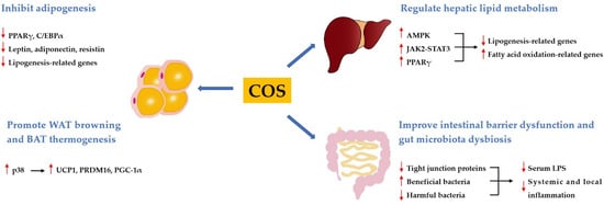 Obesity is a chronically trophic metabolic disease characterized by excessive body fat accumulation resulting from energy imbalance. Obesity is usually associated with dyslipidemia, including hypertriglyceridemia, and hypercholesterolemia. Various studies have shown that COS had good anti-obese and hypolipidemic activities. It has been demonstrated that COS was effective in reducing body weight gain, lowering blood lipid levels, decreasing hepatic fat accumulation, and inhibiting adipocyte hyperplasia and hypertrophy in high-fat diet (HFD)-induced obese rats or mice [,,,,,]. In addition, COS has been found to decrease body weight gain and plasma lipids in ob/ob mice []. These findings imply that COS may potentially be used to prevent or treat obesity and dyslipidemia. The mechanisms underlying the anti-obese and hypolipidemic activities of COS include the inhibition of adipogenesis, the promotion of white adipose tissue (WAT) browning and brown adipose tissue (BAT) thermogenesis, the regulation of hepatic lipid metabolism, the improvement of the intestinal barrier dysfunction, and gut microbiota dysbiosis (Figure 1).