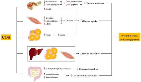 Diabetes mellitus is characterized by chronic hyperglycemia resulting from inadequate secretion or inefficient utilization of insulin []. The anti-diabetic activity of COS has been demonstrated using various types of diabetic models. The administration of COS improved the general situation and diabetic symptoms, decreased the levels of blood glucose and urine glucose, and normalized impaired glucose tolerance in neonatal streptozotocin (STZ)-induced type 2 diabetic rats, a model of non-insulin-dependent diabetes mellitus [,]. Ju et al. showed that COS treatment for 8 weeks resulted in decreased fasting blood glucose and fasting insulin levels as well as an increased insulin sensitivity index and improved oral glucose tolerance in insulin-resistant rats induced by a high-energy diet together with STZ []. Katiyar et al. reported that COS was effective in decreasing blood glucose and improving renal dysfunction in alloxan-induced diabetic mice []. In addition, COS has been found to decrease the blood glucose in db/db mice [,]. A randomized, double-blind, placebo-controlled clinical trial was conducted by Kim et al. to evaluate the effect of COS on glucose control in subjects with prediabetes. The results showed that COS supplementation of 1500 mg per day for 12 weeks in Korean subjects between the ages of 20 and 75 years significantly decreased the postprandial serum glucose level []. These findings imply that COS could be used as a natural agent for the prevention and treatment of diabetes mellitus and hyperglycemia. The mechanisms underlying the anti-diabetic and anti-hyperglycemic activity of COS include the protection of pancreatic β cells and the promotion of insulin secretion, the alleviation of insulin resistance, the inhibition of carbohydrate-hydrolyzing enzymes, the promotion of glucose uptake, and the improvement of gut microbiota dysbiosis (Figure 2).