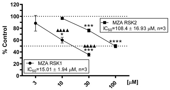 Differential effect of MZA on RSK1 and RSK2 activity. RSK1 and RSK2 kinase assays were conducted as described in Materials and Methods. Data expressed as mean ± SEM of three independent experiments (n), each experiment with triplicate determinations; * p < 0.05, *** p < 0.01, and **** p < 0.001 vs. control (DMSO). ▲▲▲▲ p < 0.001 RSK1 vs. RSK2.
