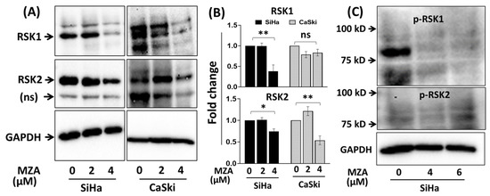 SiHa and CaSki human cervical carcinoma cells were treated with 2 and 4 µM of MZA for 48 h and protein expression of RSK1 and RSK2 was determined by Western blot assay. (A) Representative blots of RSK1 and RSK2 expression, (B) histograms from the pooled data for RSK1 and RSK2 repeats (n = 3), and (C) the use of higher concentration of MZA (4 and 6 µM) for 48 h and its effect on phospho-RSK inhibition. Data represented as mean ± SE of three independent experiments; * p < 0.05 and ** p < 0.01; ns = non-specific.