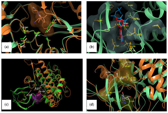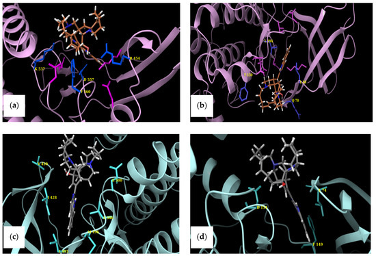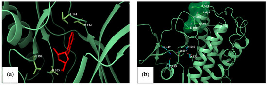The active sites of NTKD and CTKD RSK1 (PDB ID: 2Z7Q and 3RNY, respectively) with amino acids reportedly involved in binding interactions are depicted in Figure 4a,b. A comparison of the binding pockets in either terminus of RSK1 and RSK2 was performed by overlaying the selected CTKD of RSK1 (PDB ID: 3RNY) onto the CTKD of RSK2 (PDB ID: 4D9T). Figure 4a depicts the equivalent amino acids in the ATP-binding pockets of both structures. Similarly, the overlay of the NTKDs of RSK1 and RSK2 is presented in Figure 4b.