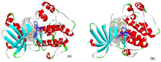 A non-competitive allosteric binding-site may be present in the protein kinase, in addition to the competitive ATP-binding site. In the present study, MZA is docked to the competitive ATP-binding site only, since the location of the allosteric site is yet to be determined in many kinases. The predicted binding affinity of MZA is compared to ATP in order to decipher selectivity trends of MZA vs. ATP. Table 1 indicates that MZA is a potential inhibitor for a number of protein kinases, such as RSK1, LCK, GSK3β, NEK2α, SAPK2α, CSK, PHK, and SAPK3, when compared to ATP. However, despite the favorable binding affinity, upon closer inspection, MZA does not bind in the ATP-binding pocket in many of the protein kinases, as the binding pocket is narrow and the molecular structure of MZA is bulky. For example, MZA was predicted to bind to PDK1, even though it displayed poor in vitro activity. Upon visual inspection, it appears that MZA binds at the external opening of the binding pocket, thus occupying different binding space relative to ATP (Figure 6a). In contrast, the RSK1–MZA complex has MZA bound at the same locus of the binding pocket as ATP (Figure 6b). Predicted MZA-bound kinase complexes are shown in Supplementary Materials Figures S1–S27.