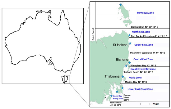 Tasmanian biotoxin management zones for J. edwardsii, as provided in the Rock Lobster Biotoxin Monitoring and Decision Protocols 2020 [11]. Blue stars indicate the location of sentinel mussel sites.